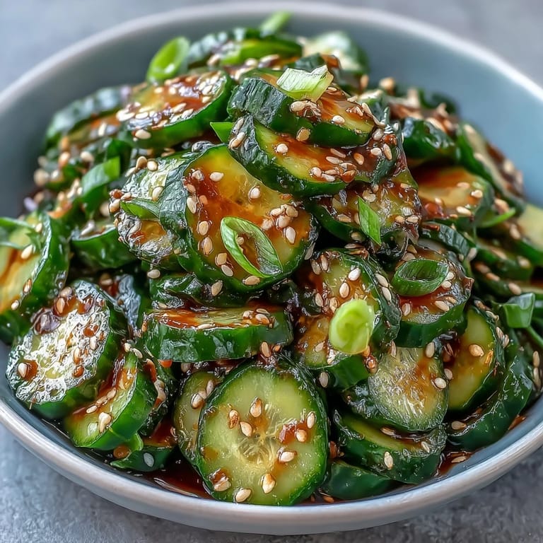 Dieser erfrischende Gurkensalat kombiniert dünn geschnittene Gurken und Frühlingszwiebeln mit einer aromatischen Mischung aus Sojasauce, Sesamöl, Reisessig und Gewürzen. Das Dressing sorgt für ein perfekt ausgewogenes Umami-Erlebnis, während geröstete Sesamsamen für zusätzlichen Crunch und ein nussiges Aroma sorgen. Ideal als leichte Beilage oder sommerlicher Snack lässt sich dieser Salat einfach zubereiten und kann mit frischen Kräutern wie Koriander variiert werden.
