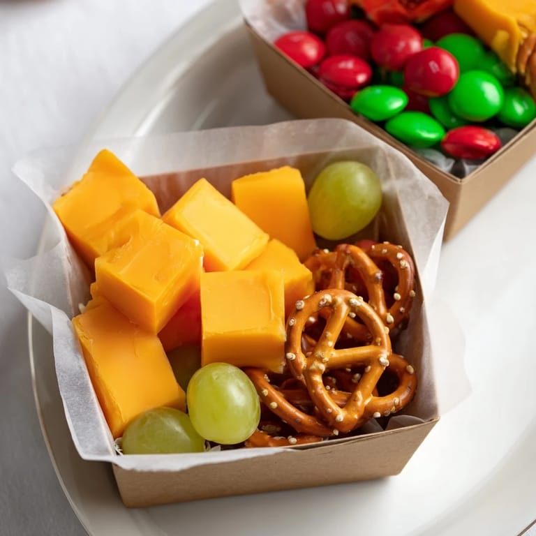 - Herzhafte Snacks: 2 Tassen Cheddarkäsewürfel, 1 Tasse Mini-Salzbrezeln, 1 Tasse gemischte Nüsse (oder geröstete Kichererbsen als vegetarische Option), 1 Tasse grüne Trauben (gewaschen und entstielt)