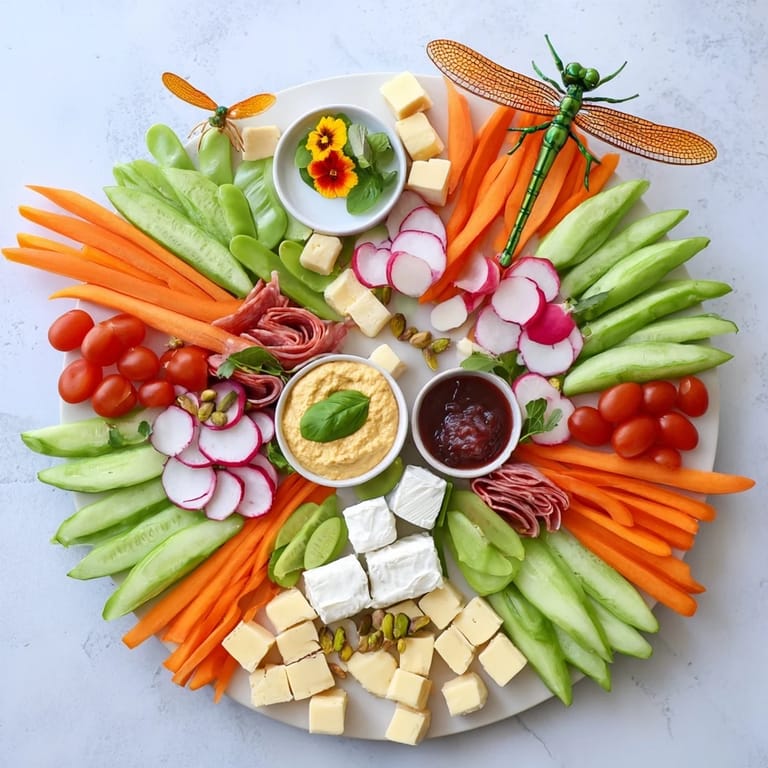 Diese Vorspeisenplatte besticht durch eine bunte Vielfalt an frischem Gemüse, Käse und Aufschnitt, kunstvoll auf einem großen Tablett arrangiert. Die Farben und Texturen erinnern an die filigranen Flügel von Libellen, was sie optisch besonders macht. Unterschiedliche Dips und knusprige Cracker ergänzen das Geschmackserlebnis. Mit frischen Kräutern, essbaren Blüten und gerösteten Pistazien garniert, eignet sich diese Platte ideal für gesellige Anlässe. Eine vegetarische Variante lässt sich leicht umsetzen, indem der Aufschnitt weggelassen und durch Antipasti ersetzt wird.