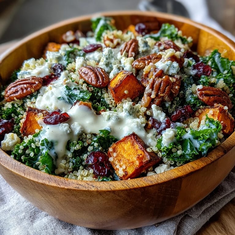 Diese herzhafte Schale verkörpert die besten Aromen des Herbstes in einer einzigen Schüssel. Die Kombination aus süßen, gerösteten Süßkartoffeln und nussigem Quinoa bildet eine ideale Grundlage für die anderen Zutaten. Der Grünkohl wird sanft massiert, wodurch er zarter wird und das Dressing besser aufnimmt. Pekannüsse bringen eine angenehme Textur und einen buttrigen Geschmack ein, während getrocknete Cranberries eine natürliche Süße hinzufügen. Der Blauschimmelkäse liefert eine herzhafte Note, die wunderbar mit dem säuerlichen Zitronen-Tahini-Dressing harmoniert. Dieses Gericht ist nicht nur optisch ansprechend, sondern auch ausgewogen und nahrhaft.