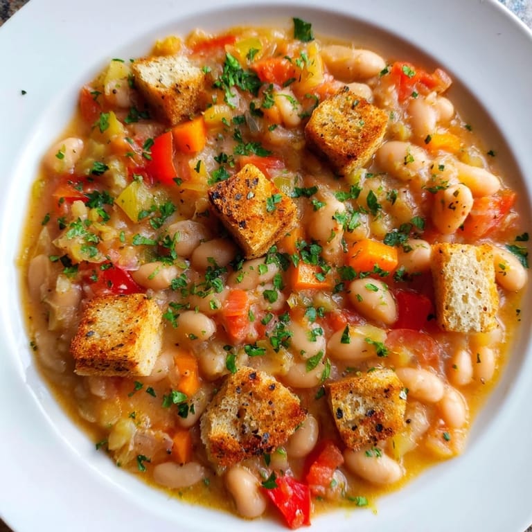 Ein herzhafter, wohltuender Eintopf mit cremigen Bohnen, reifen Tomaten, duftenden Kräutern und knusprigen Roggencroutons — ein rustikales Gericht, perfekt für kühle Abende.