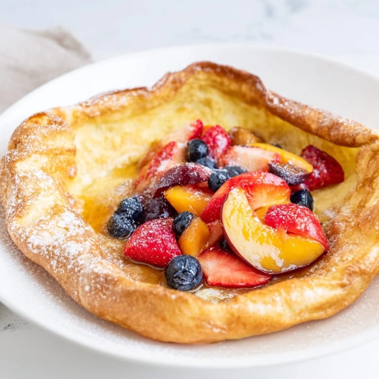 Merken Fluffige, im Ofen gebackene deutsche Pfannkuchen, serviert warm mit einer Mischung aus frischem saisonalem Obst und einem Schuss goldenen Honig. Perfekt für ein köstliches Frühstück oder Brunch.