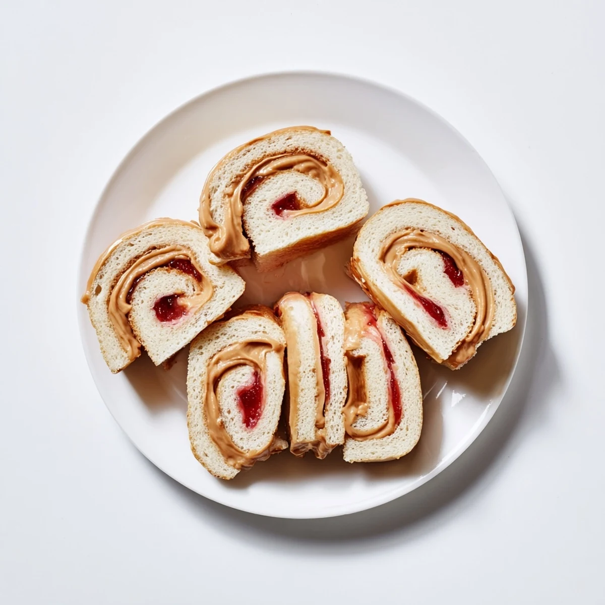 Merken Eine lustige Variante des klassischen Erdnussbutter-und-Gelee-Sandwichs, diese Pinwheel-Rollen sind einfach zuzubereiten, perfekt für Kinder und ideal für Lunchboxen oder Snacks.