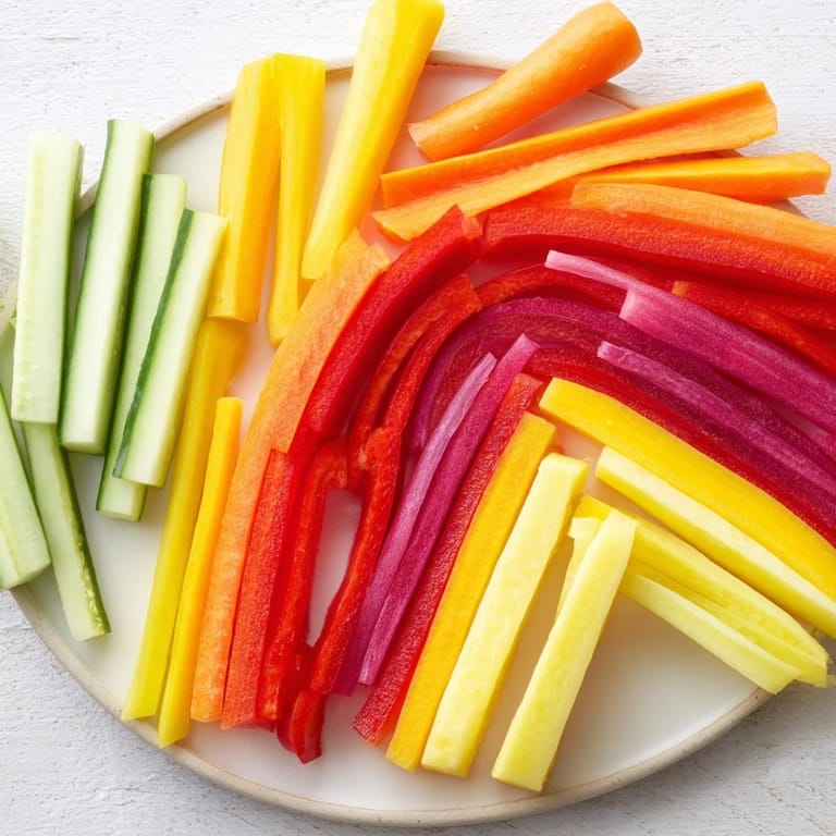 Dieser bunte Snack besteht aus verschiedenfarbigen Gemüsesticks, liebevoll in einer Regenbogenform arrangiert. Mit knackigen Paprikastreifen in Rot, Orange und Gelb, frischem Gurken und violetten Karotten oder Rotkohl bietet er eine leckere und gesunde Zwischenmahlzeit. Dazu passt ein cremiger Dip wie Hummus oder Ranch, der optional gereicht wird. Die Zubereitung ist schnell und einfach, ideal für Kinder und Erwachsene, die eine farbenfrohe und vegetarische Köstlichkeit genießen möchten.