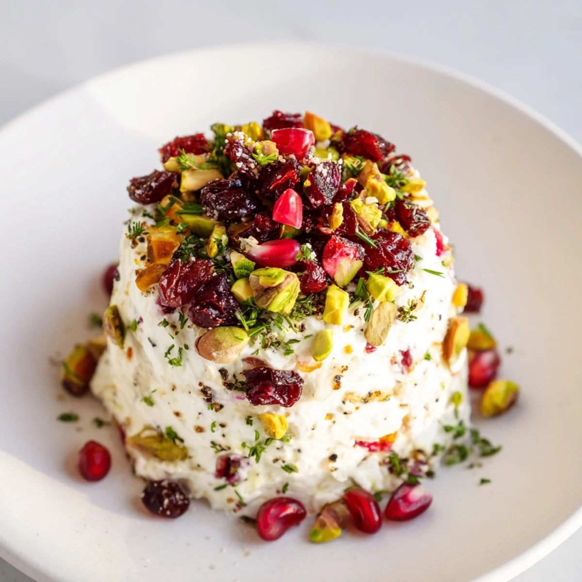 - Gehackte Cranberries, gehackte Pistazien und Granatapfelsamen auf den Käsebaum drücken, dabei einige Bereiche überlappen lassen und andere frei lassen für visuelles Interesse.