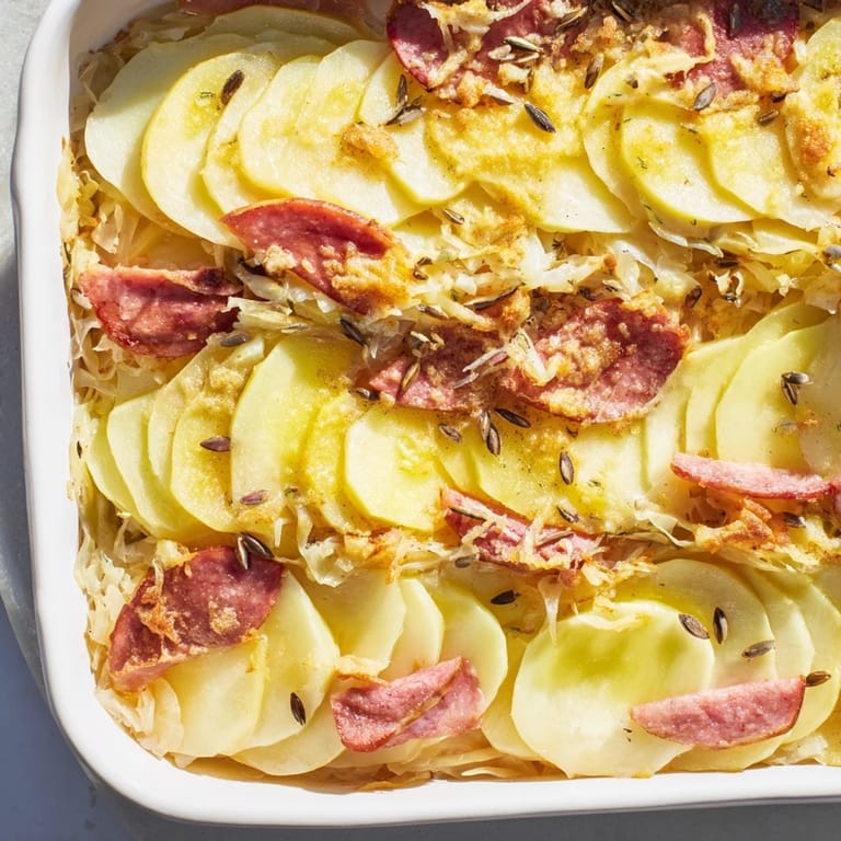 Merken Ein wohltuender, herzhafter Auflauf mit Schichten aus Sauerkraut, zarten Kartoffeln, würziger Wurst und süßen, karamellisierten Ahorn-glasierten Äpfeln – eine perfekte Balance aus herzhaft und süß.