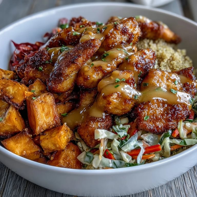 Diese lebendige Schüssel vereint zartes, gewürztes Hühnchen mit gerösteten Süßkartoffeln und leichtem Quinoa. Der knusprige Rotkohlsalat bringt frische Textur, während das hausgemachte Hot Honey Senf-Dressing die perfekte Balance aus Süße und Schärfe liefert. Alles wird in nur 50 Minuten zubereitet und ergibt vier nahrhafte Portionen.