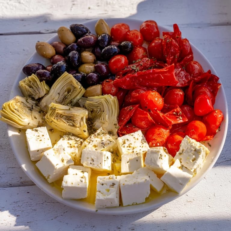 Diese mediterrane Platte kombiniert intensiv aromatische schwarze Oliven mit sonnengetrockneten Tomaten und cremigem Feta. Ergänzt durch marinierte Artischockenherzen und geröstete rote Paprika entsteht eine farbenfrohe Variation, die sich sowohl geschmacklich als auch optisch hervorragend eignet. Mit frischem Oregano, Zitronenschale und bestem Olivenöl verfeinert, bringt sie einen frischen mediterranen Geschmack auf den Tisch. Die Zubereitung ist unkompliziert und benötigt nur wenige Minuten. Ideal als Beilage oder leichter Genuss bei geselligen Anlässen.
