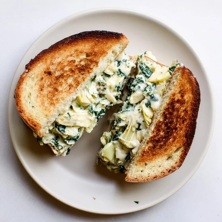 Merken Ein Artichoke Spinach Grilled Cheese Sandwich ist die ultimative Definition von Wohlfühlessen. Diese dekadente Kreation kombiniert eine cremige Füllung aus Spinat und Artischocken mit perfekt geschmolzenem Käse, eingebettet zwischen zwei goldbraun gerösteten, knusprigen Scheiben Sauerteigbrot. In nur 25 Minuten zaubern Sie ein Gourmet-Sandwich, das wie ein warmer Dip zum Hineinbeißen schmeckt.
