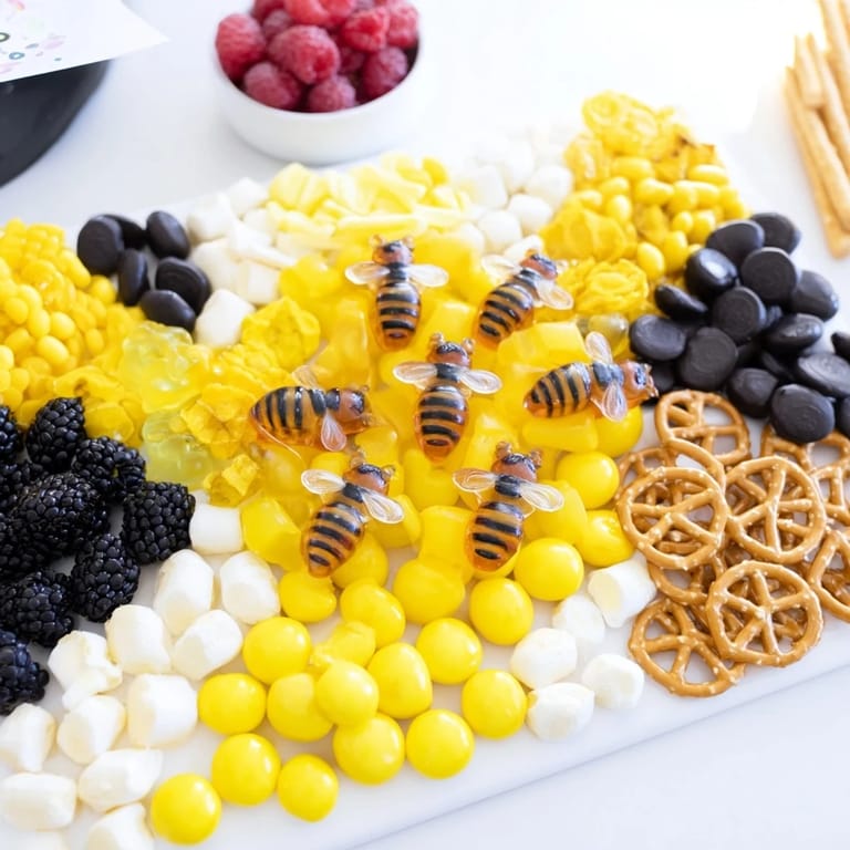 Honigbienenförmige Gummis oder Schokoladenbonbons bilden den Mittelpunkt, ergänzt durch gelbe Jelly Beans und schwarze Lakritzrollen für den klassischen Streifenlook.