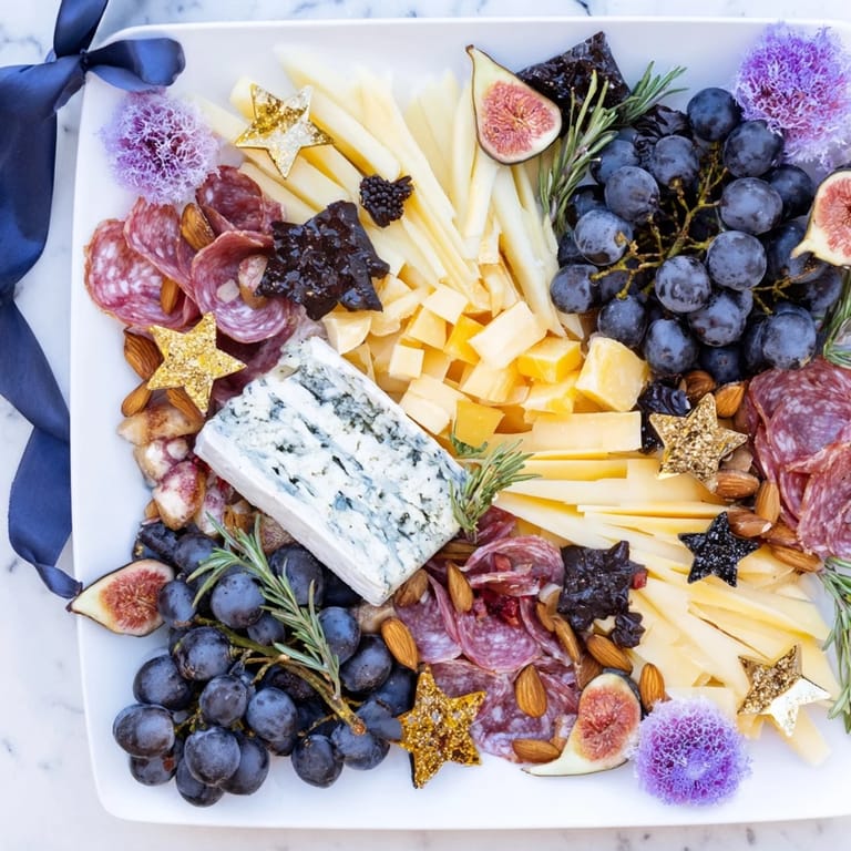 Merken Ein bezauberndes Grazing-Board, inspiriert vom Nachthimmel, mit einer Auswahl an handwerklichen Käsesorten, Wurstwaren, Früchten und kosmisch gestalteten Leckereien – perfekt für Abendveranstaltungen oder besondere Anlässe.