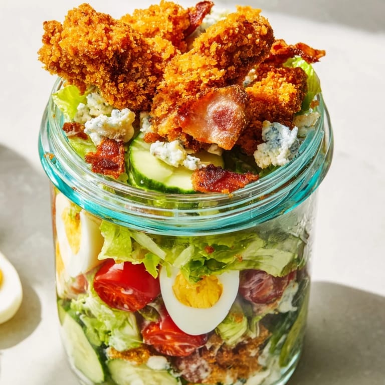 A vibrant Crispy Chicken Cobb Jar Salad layered with creamy blue cheese, diced cucumber, and golden baked chicken pieces for lunch. Merken