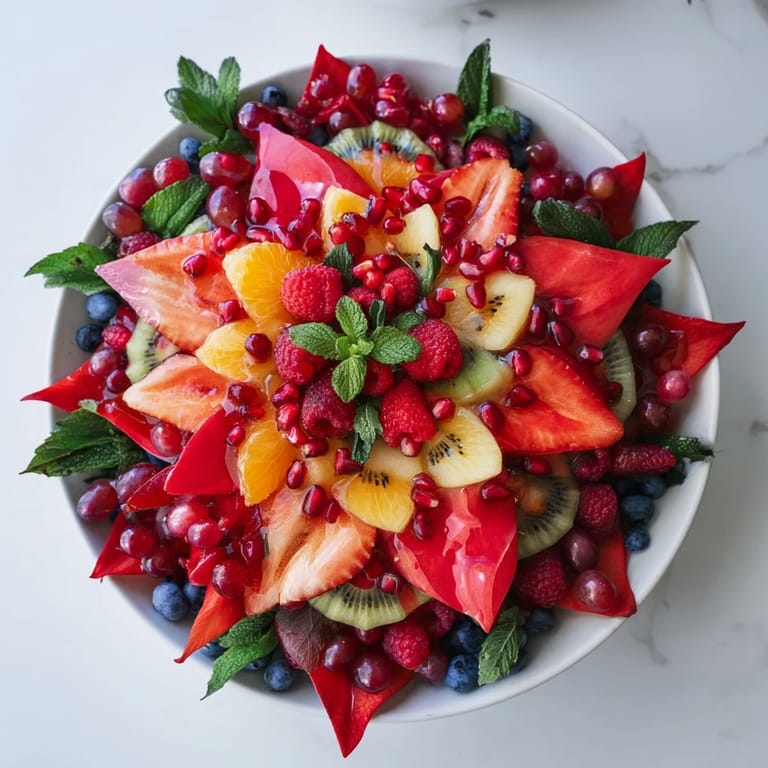 - Früchte: 2 Tassen frische Erdbeeren, entstielt und halbiert, 1 Tasse Himbeeren, 1 Tasse rote Trauben, halbiert, 1 Tasse Granatapfelkerne, 1 große Mango, geschält und in Scheiben, 2 Kiwis, geschält und in Scheiben, 1 Orange, geschält und in Segmente, ½ Tasse Heidelbeeren