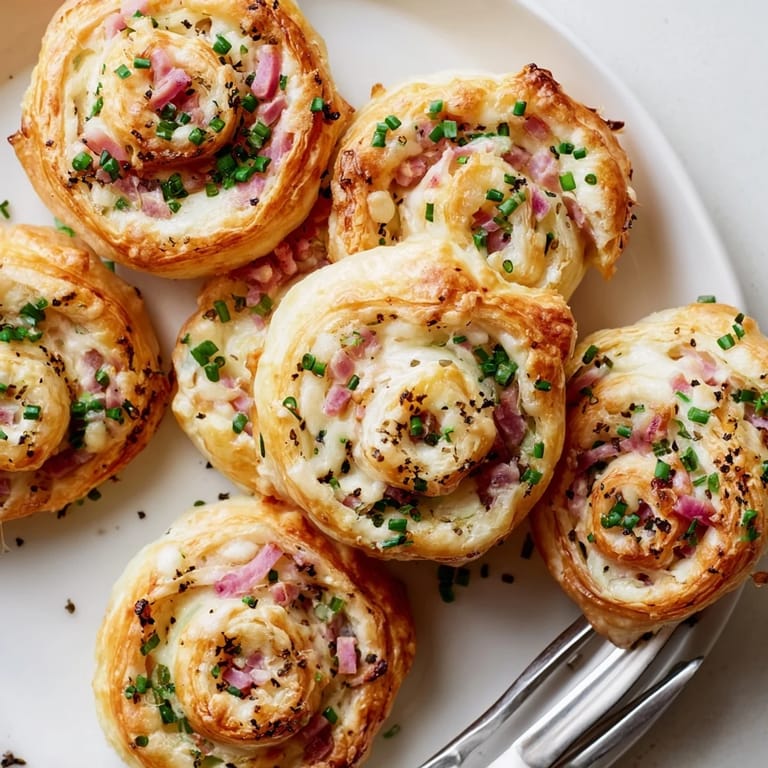 Merken Herzhafte Schinken-Käse-Schnecken sind ein beliebtes, schnell gemachtes Fingerfood, das den klassischen Geschmack des elsässischen Flammkuchens in knusprigem Blätterteig vereint. Mit cremigem Käse, würzigem Schinken und einem Hauch von Zwiebel begeistern diese goldenen Spiralen jeden Gast.