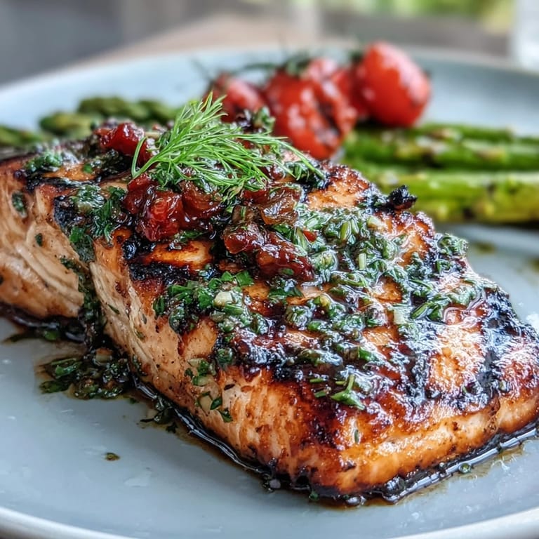 Merken There's something about the smell of lemon hitting hot grill grates that makes everything feel like summer, even when it isn't. My neighbor dropped off a gorgeous salmon fillet one afternoon, and I had exactly what was in my garden and pantry to make something memorable. The marinade came together in the time it took to heat the grill, and watching those herbs release their oil as the fish cooked was like witnessing something simple become extraordinary.