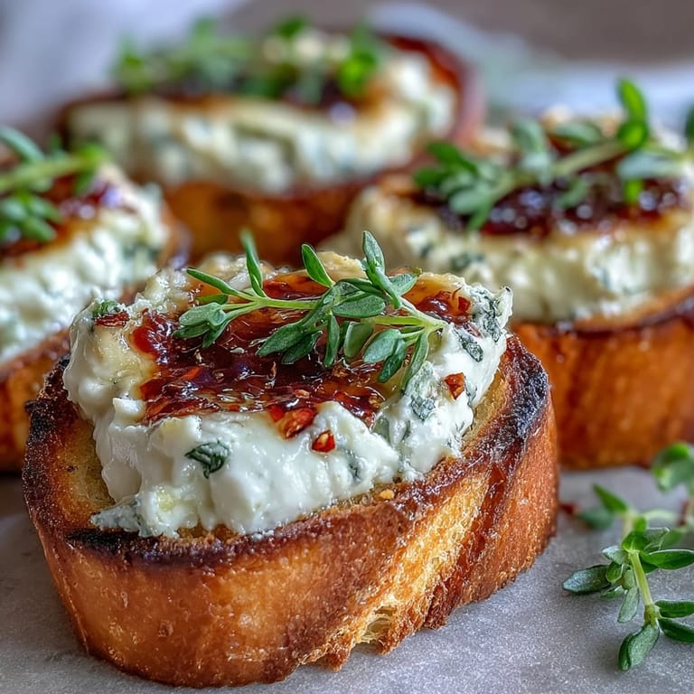 Geröstetes Baguette mit cremigem Ziegenkäse-Frischkäse-Aufstrich und scharfem Honig. Ideal als elegante Vorspeise oder Party-Häppchen.