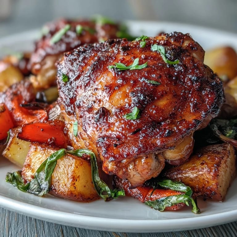 Merken There's something deeply satisfying about sliding a single sheet pan into the oven and walking away knowing dinner will practically cook itself. I discovered this particular combination on a Tuesday evening when my fridge was oddly full yet my energy was oddly empty, and I realized that roasting chicken thighs alongside whatever vegetables needed rescuing would solve both problems at once. The skin gets crackling and golden, the vegetables caramelize at the edges, and somehow every element tastes better for having shared the same pan. It became my go-to when I wanted something that felt restaurant-quality but required almost no fuss.