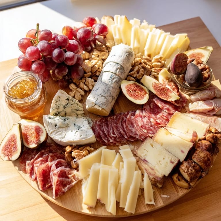 - Nüsse & Extras: 50 g Marcona-Mandeln, 50 g geröstete Walnüsse, 30 g Honigwabe oder hochwertiger Honig, 50 g getrocknete Aprikosen