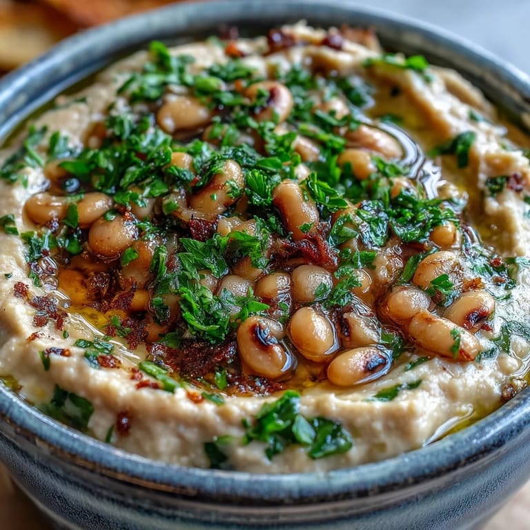 Smashed Black-Eyed Peas dip in a rustic bowl, garnished with fresh parsley and lemon zest for a bright, savory flavor. Merken